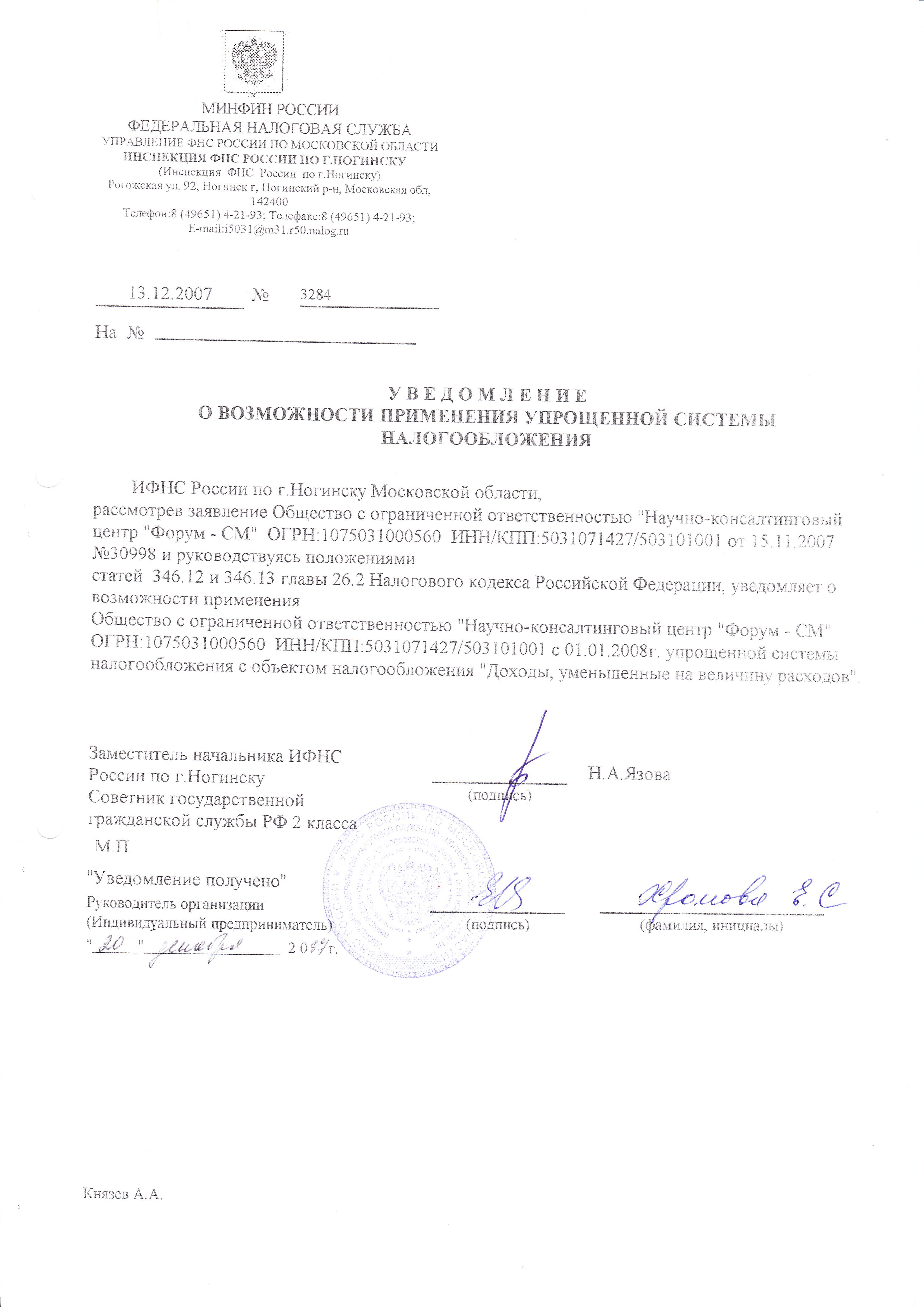 ООО «Форум-СМ» работает с применением упрощенной системы налогообложения (Уведомление об УСН).